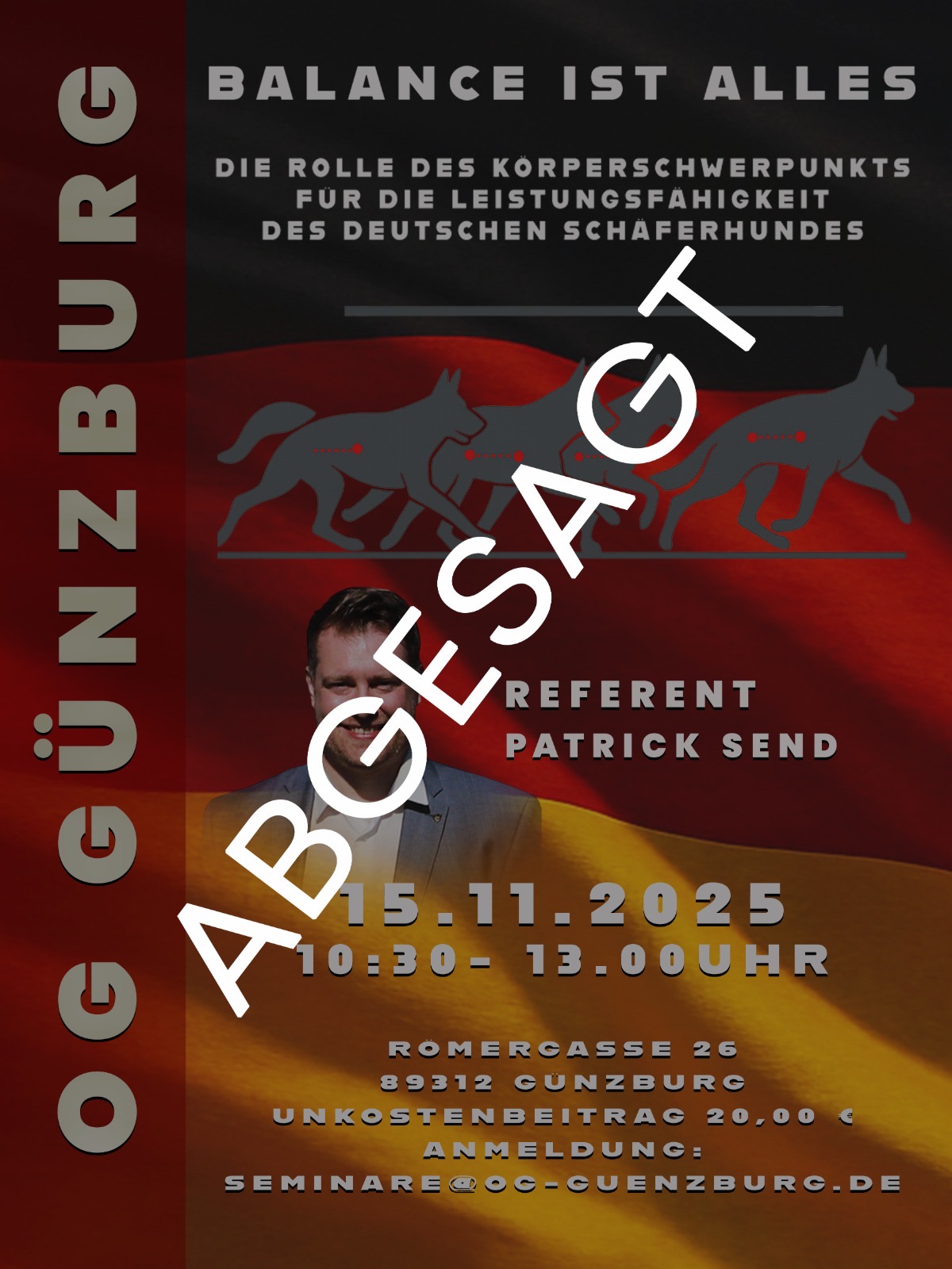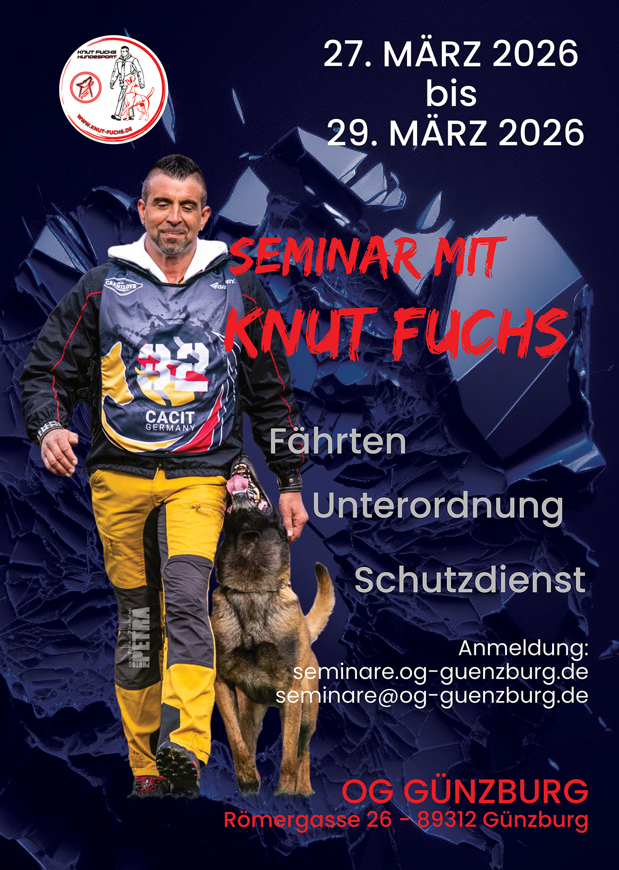 Herzlich Willkommen OG - GünzburgSchäferhundeverein Fährte Unterordnung Schutzdienst Unsere Nächsten Veranstaltungen BALANCE IST ALLES15. NOVEMBER 2025-ABGESAGT- Die Rolle des Körperschwerpunkts für die Leistungsfähigkeit des Deutschen Schäferhundes. Anmeldung: seminare@og-guenzburg.de Schäferhundeverein Günzburg, Römergasse 26, 89312 GünzburgBeginn 10:30Ende ca. 13:00 Seminar mit Knut Fuchs27.MÄRZ 2026 - 29.MÄRZ 2026 Fährte - Unterordnung - Schutzdienst Anmeldung: seminare.og-guenzburg.de Schäferhundeverein Günzburg Römergasse 26,89312 Günzburg Baustellentagebuch 2024-10-18 Forum Günzburg Verein Termine Züchter Geschichte KOntakt